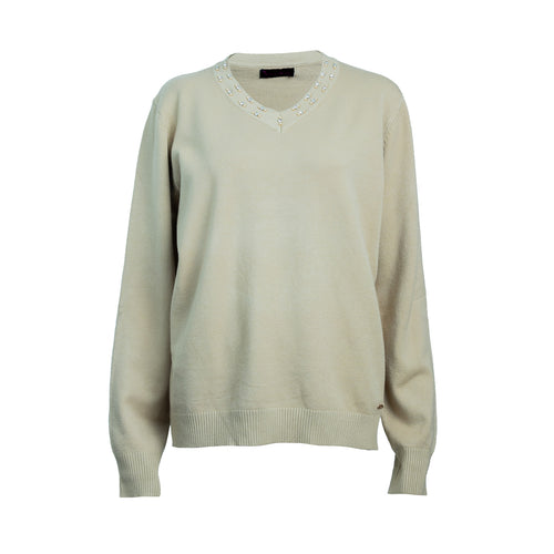 Sueter cuello "V" BANANA LIMÓN con tejido bordado y aplicación de brillo para dama