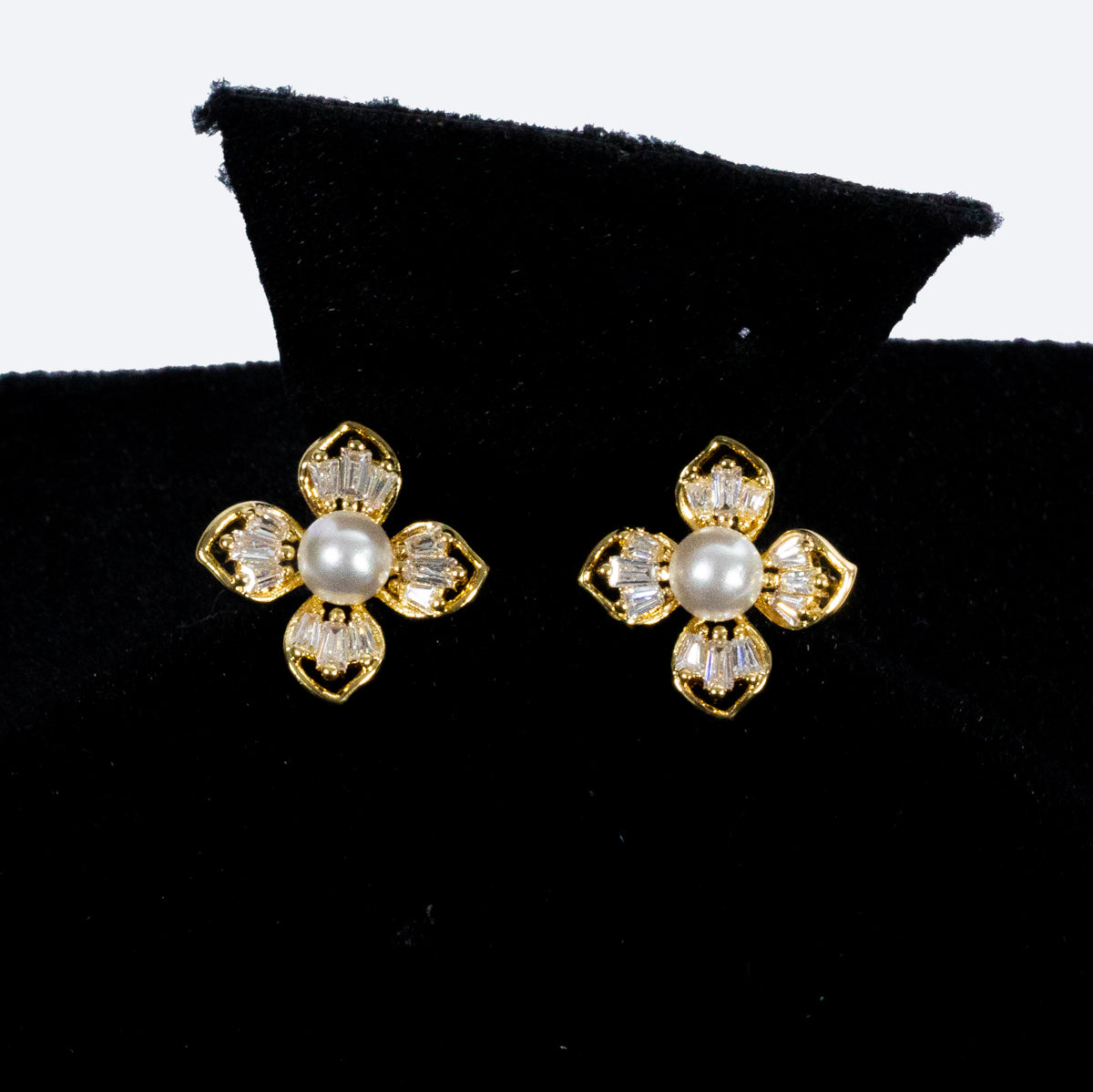 Tipo: Aretes dorados en forma de flor con perla y cristales