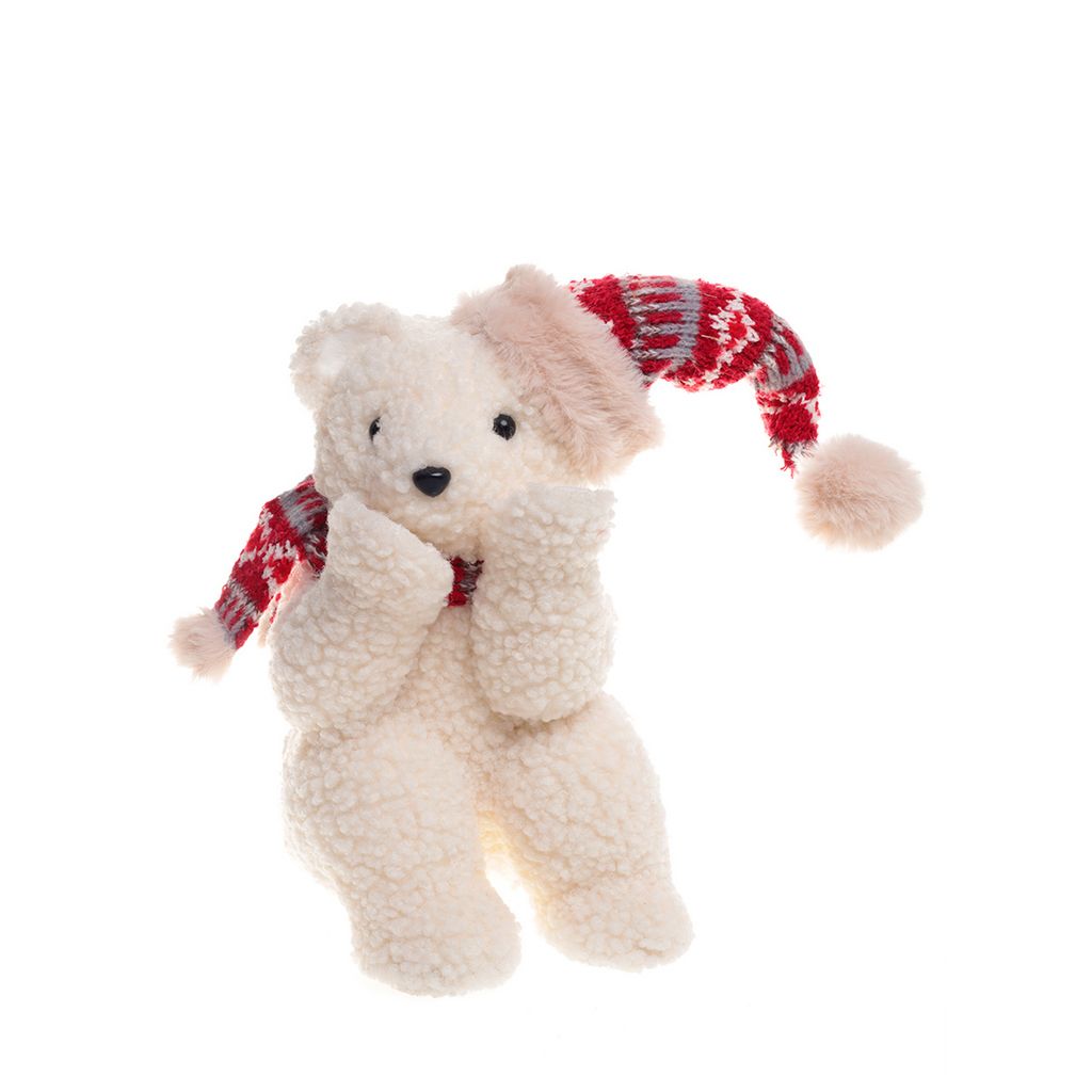 Adorno navideño EXIMEX oso sentado con bufanda y gorro rojo