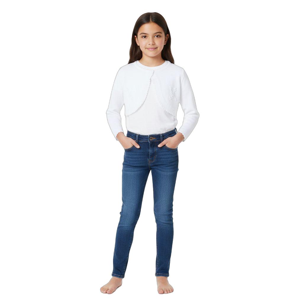 Bolera blanca de semiabrigo para complementar un vestido blusa o camiseta de manga larga. Cómoda y muy moderna. Para niñas.
