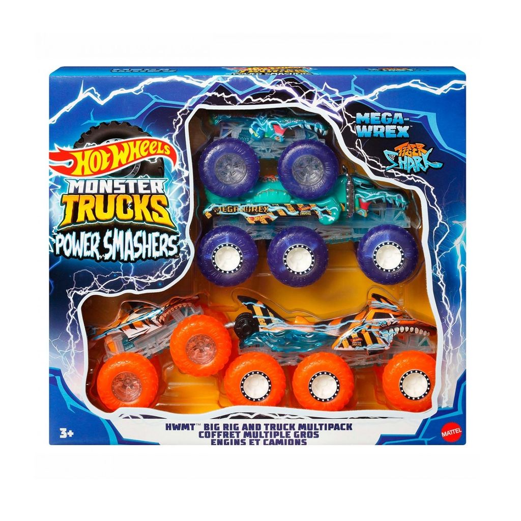 El paquete Monster Trucks Power Smashers Truck & Big Rig de Hot Wheels combina a los vehículos favoritos de los fans, Tiger Shark y Mega-Wrex, con su respectivo Big Rig, para una destrucción épica. Cada camión de juguete a escala 1:64 y su vehículo correspondiente cuenta con los brillantes y eléctricos diseños de Powers Smashers, que llevan el aplastamiento y choque a otro nivel, ¡igual que en la serie de YouTube Kids! Remolca a Tiger Shark detrás de su Big Rig y carga a Mega-Wrex encima de su Big Rig, ¡y luego dirígete a la gran batalla! Con un empaque exclusivo de Power Smashers, este paquete es ideal para jugar o exhibir. Los colores y las decoraciones pueden variar.