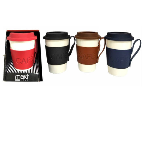 Vaso MAKI de porcelana con tapa de silicón y manga tipo piel capacidad 12 onzas