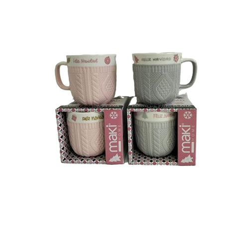 Taza MAKI de porcelana con diseño tipo sweater navideño en color rosa y gris capacidad 12 onzas